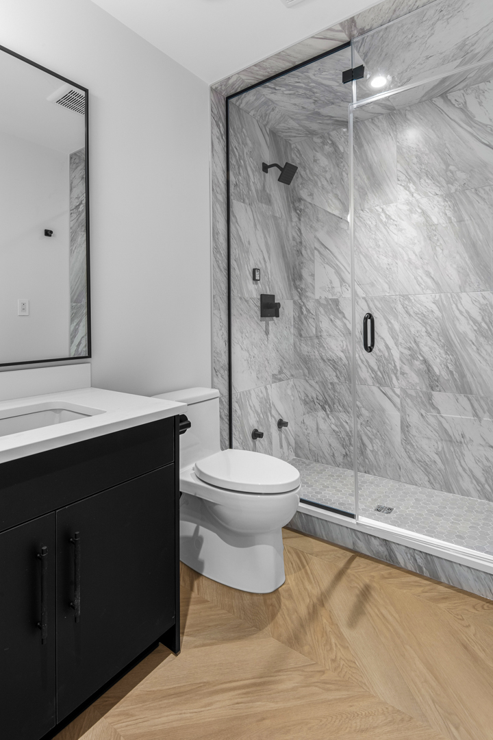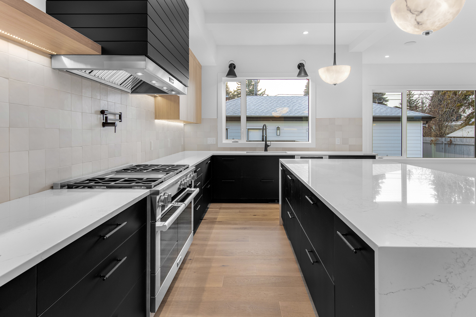 The design incorporates state-of-the-art appliances seamlessly integrated into the cabinetry, maintaining a streamlined look that emphasizes practicality without sacrificing style. Strategic lighting accentuates the clean, geometric shapes within the space, highlighting the exquisite craftsmanship of the millwork. The expansive windows ensure ample natural light, enriching the warmth of the wood and enhancing the overall openness of the layout.