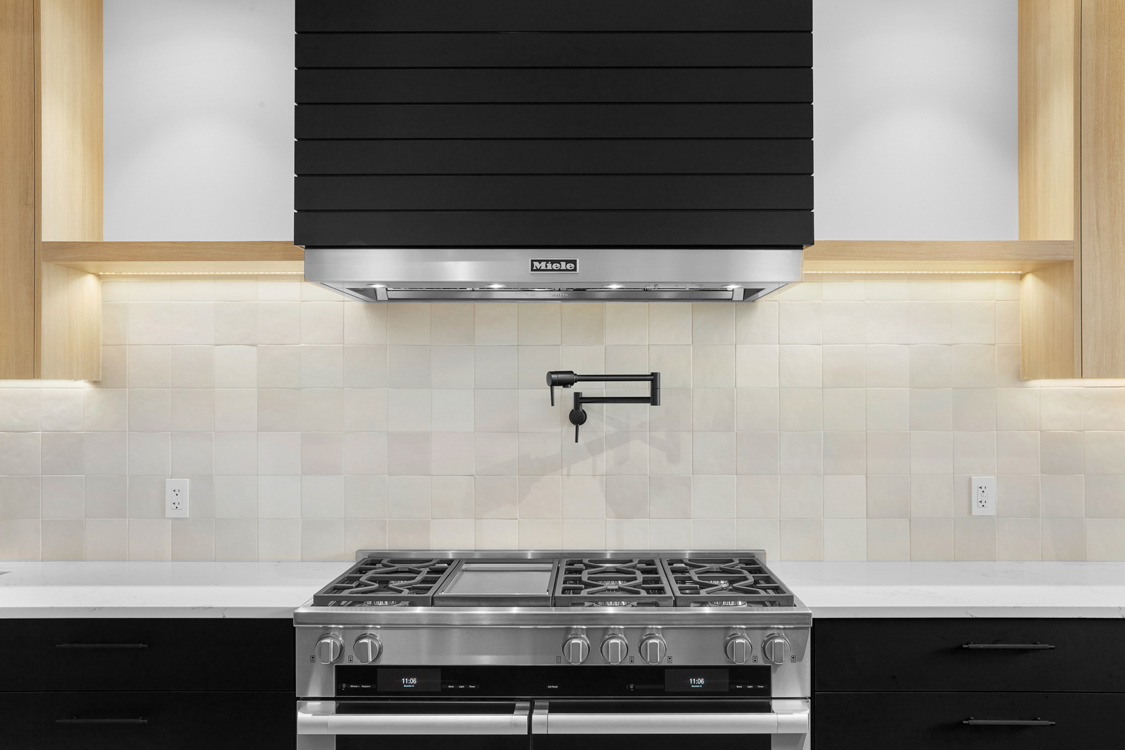 The Behouses Millwork project exemplifies the harmony of modern design principles with functional elegance, offering a striking balance between warm wood tones and sleek black finishes. Each space within the kitchen exudes a contemporary chic atmosphere, underscored by clean lines and minimalistic decor. The juxtaposition of natural wood elements with the deep black of the cabinetry and appliances creates a visually appealing contrast that is both inviting and sophisticated.