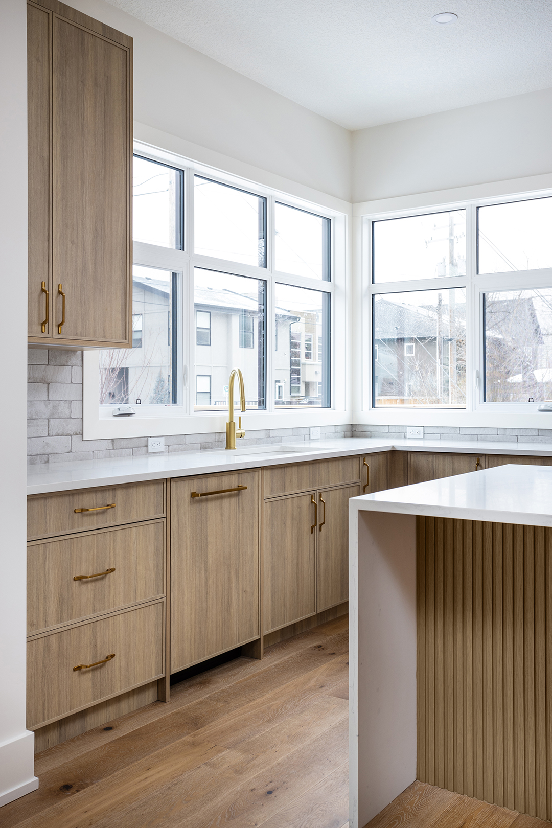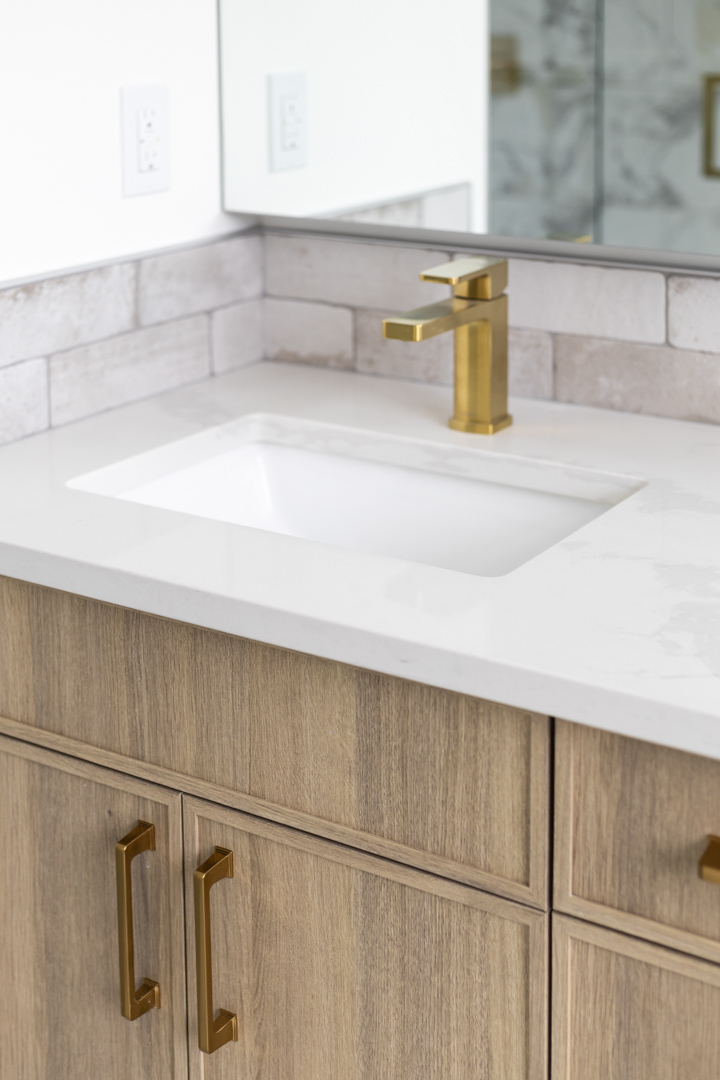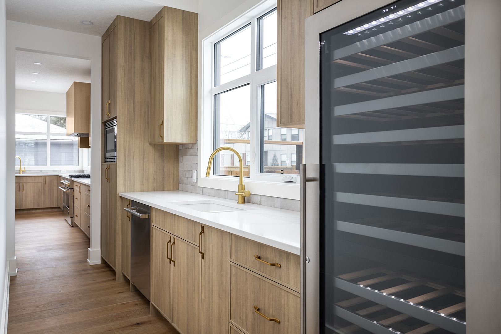 - Color Palette and Textures: The kitchen features a neutral color palette, highlighted by the natural wood tones and complemented by gold hardware, adding a touch of luxury. The crisp white countertops and backsplash provide a bright, clean look that contrasts beautifully with the wooden elements.