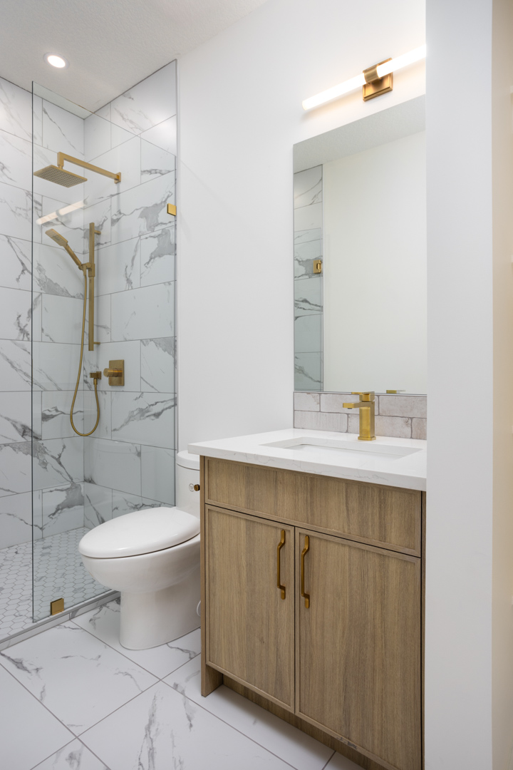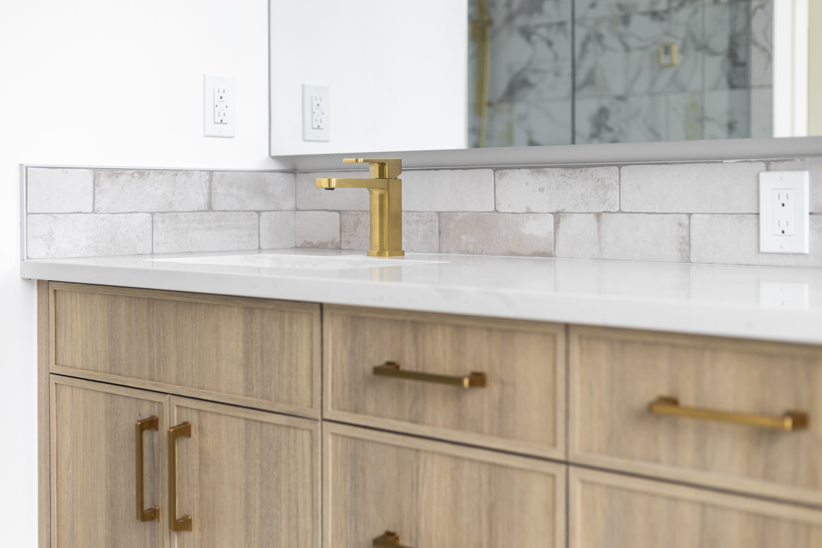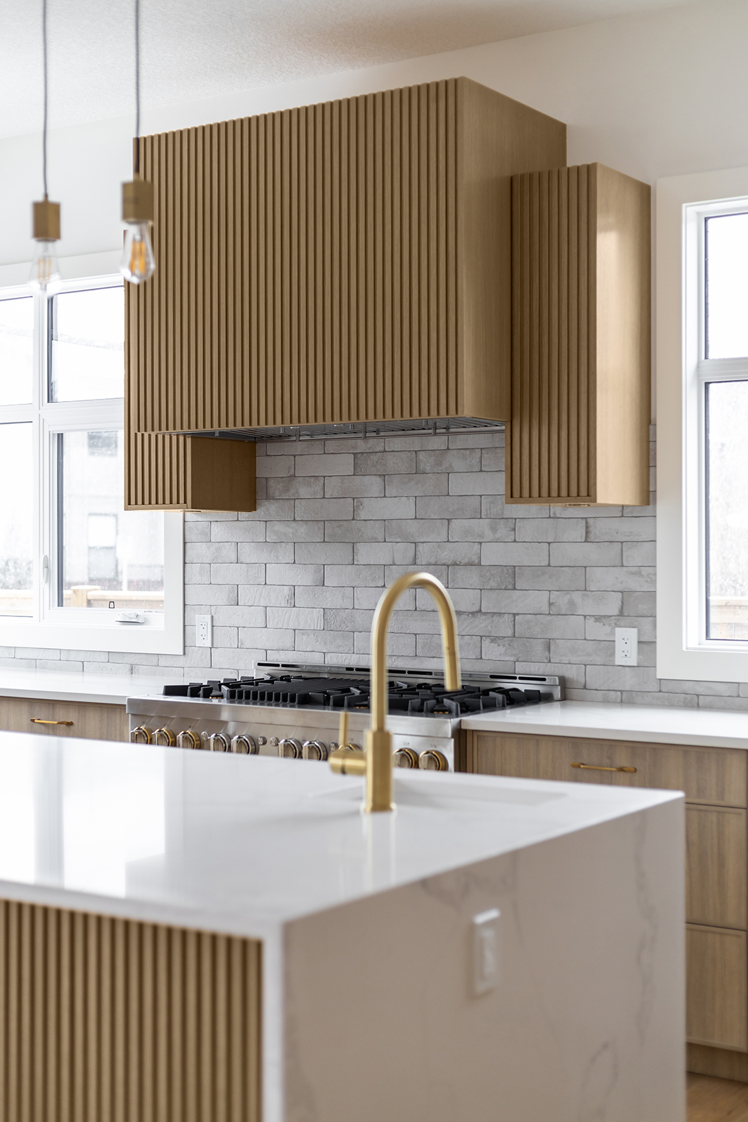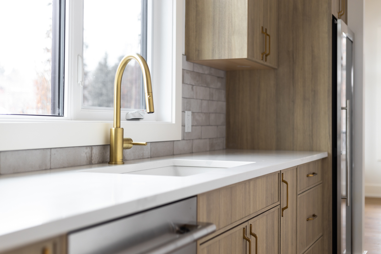- Color Palette and Textures: The kitchen features a neutral color palette, highlighted by the natural wood tones and complemented by gold hardware, adding a touch of luxury. The crisp white countertops and backsplash provide a bright, clean look that contrasts beautifully with the wooden elements.