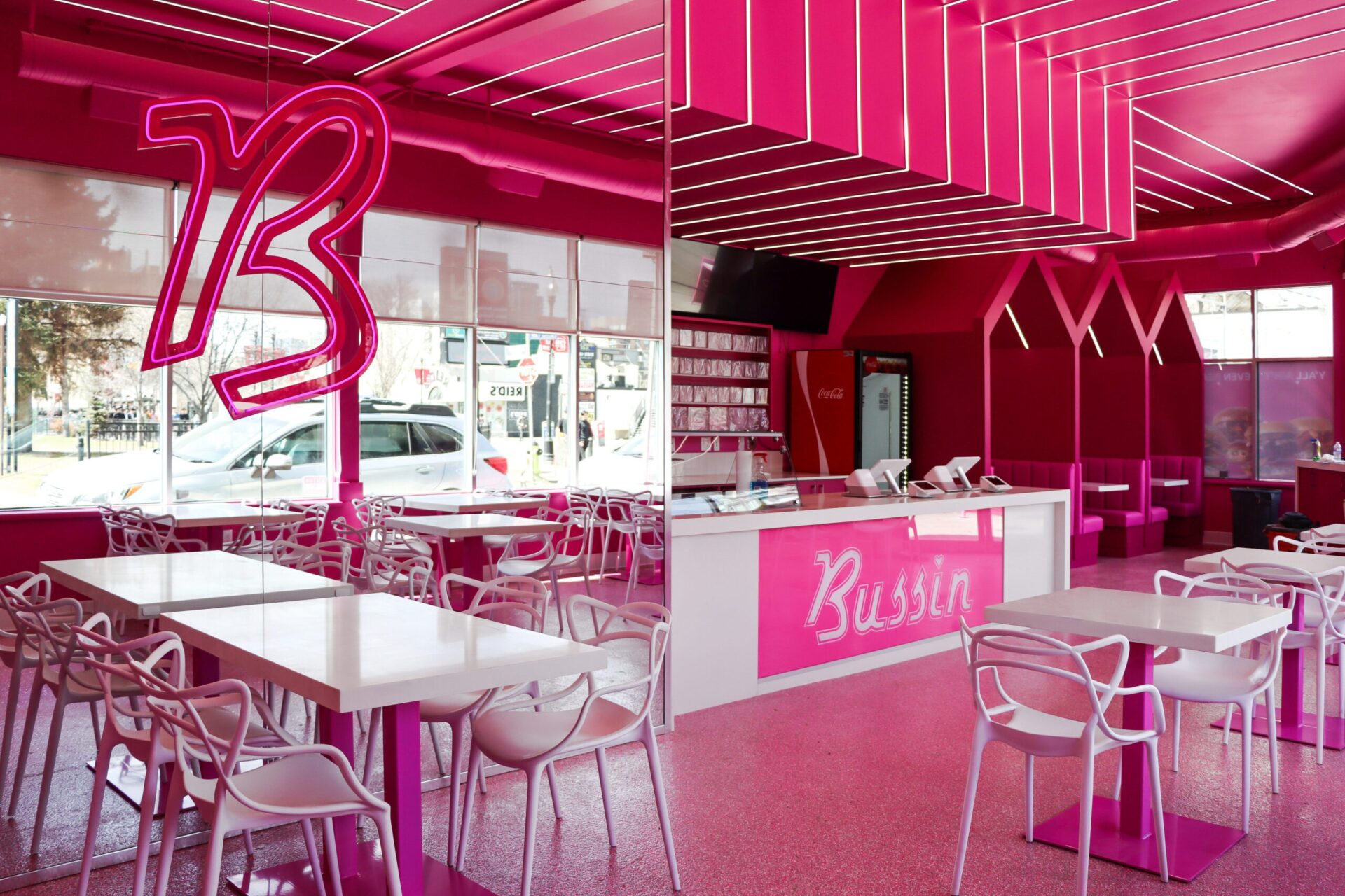 The centerpiece of the space is the custom millwork for the service counter, featuring the “Bussin” logo prominently displayed on the front. The cabinetry behind the counter is designed for efficiency and style, with open shelving and integrated storage solutions that cater to the fast-paced environment of a burger restaurant. The bright pink finish on the cabinetry contrasts sharply with the sleek white countertops, adding a sense of freshness and cleanliness to the overall design.