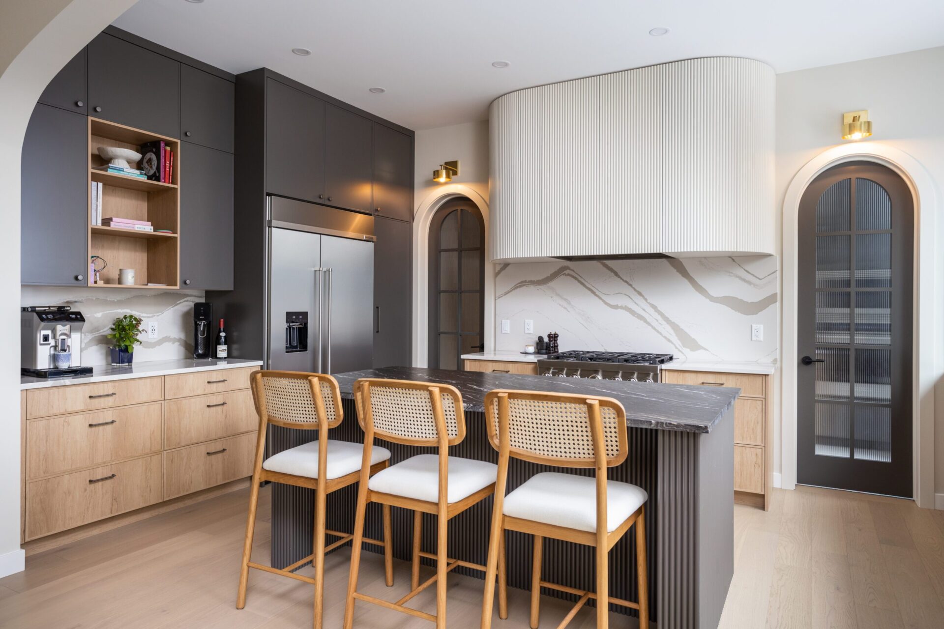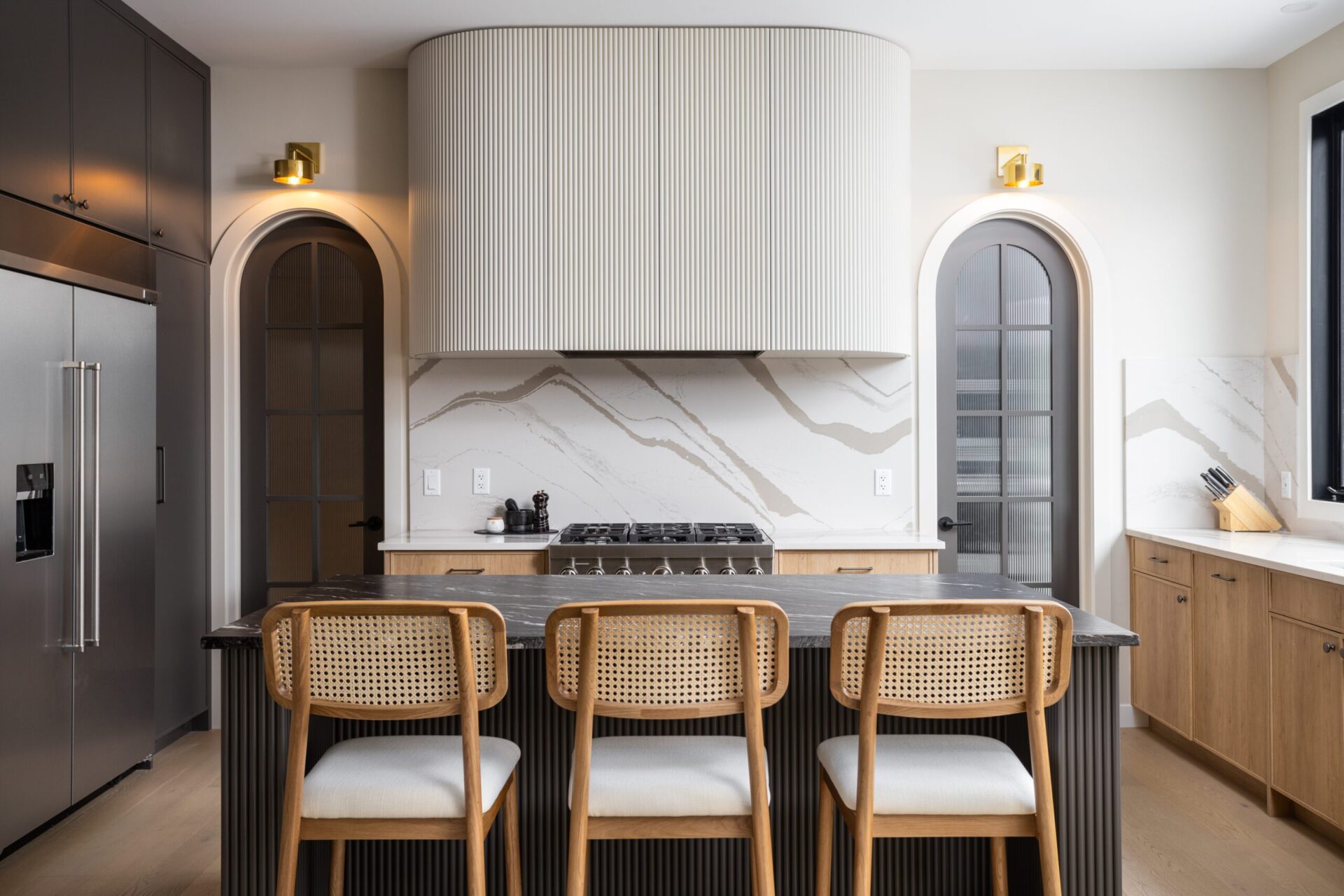 The backsplash is a standout feature, with its elegant, flowing pattern that complements the organic tones of the wood while adding a touch of sophistication. The arched doorways and custom-built cabinetry extend the design language throughout the home, creating a cohesive aesthetic that is both modern and timeless.