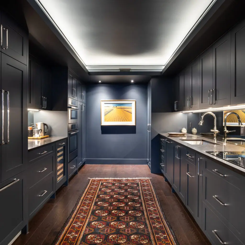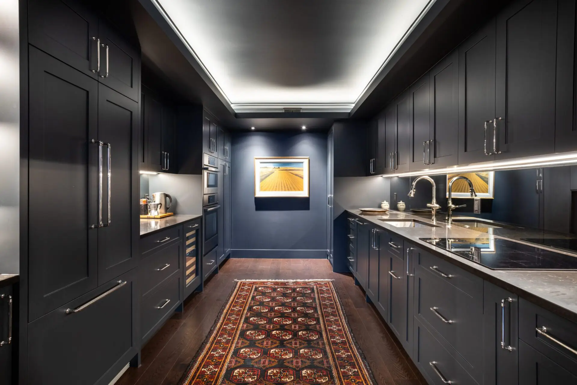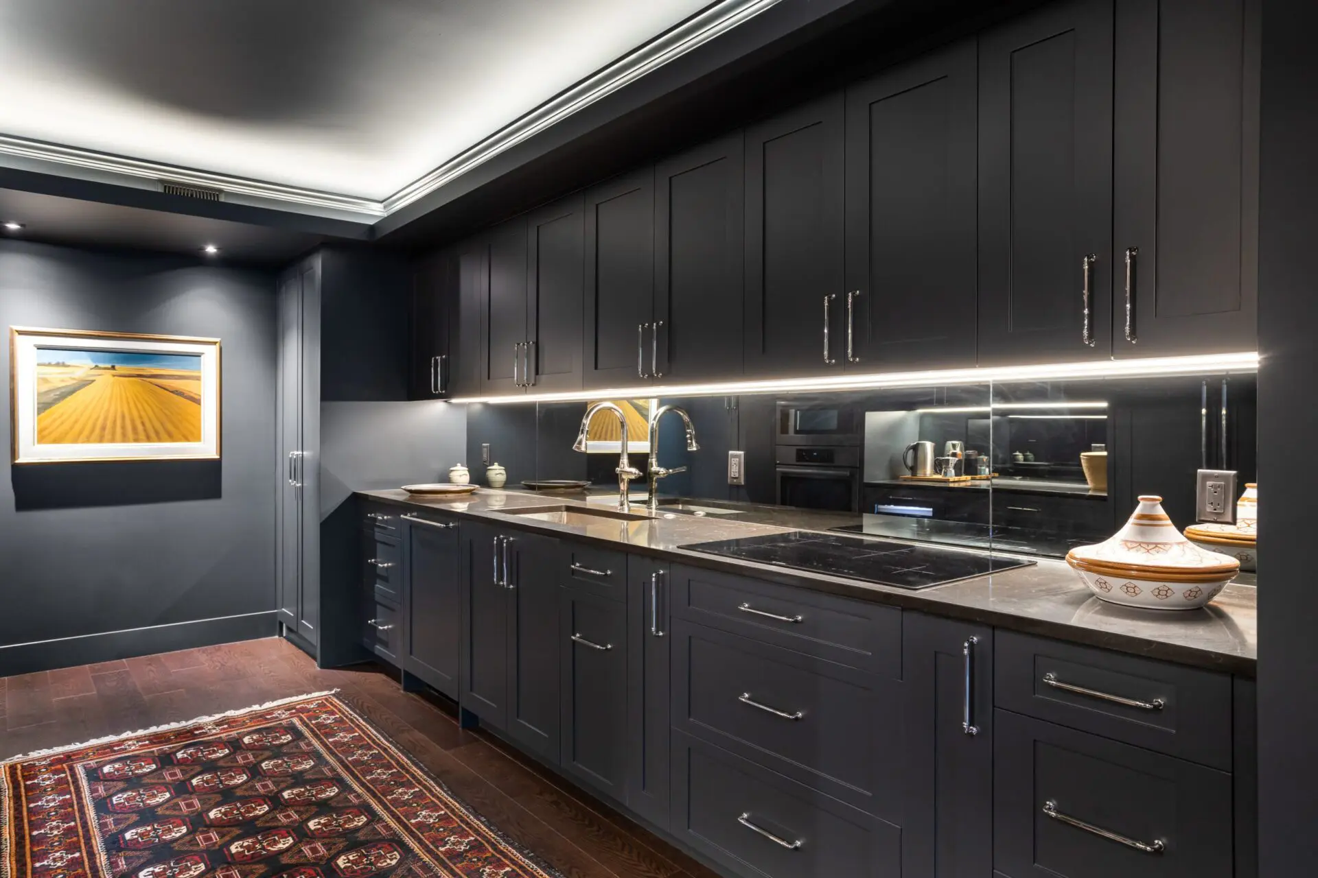 The cabinetry is meticulously designed with sleek, modern lines, featuring integrated handles that maintain a streamlined look. The use of high-end materials, such as polished stone countertops and stainless steel fixtures, enhances the overall elegance of the space. Under-cabinet lighting adds a warm, inviting glow, highlighting the craftsmanship and details of the millwork.