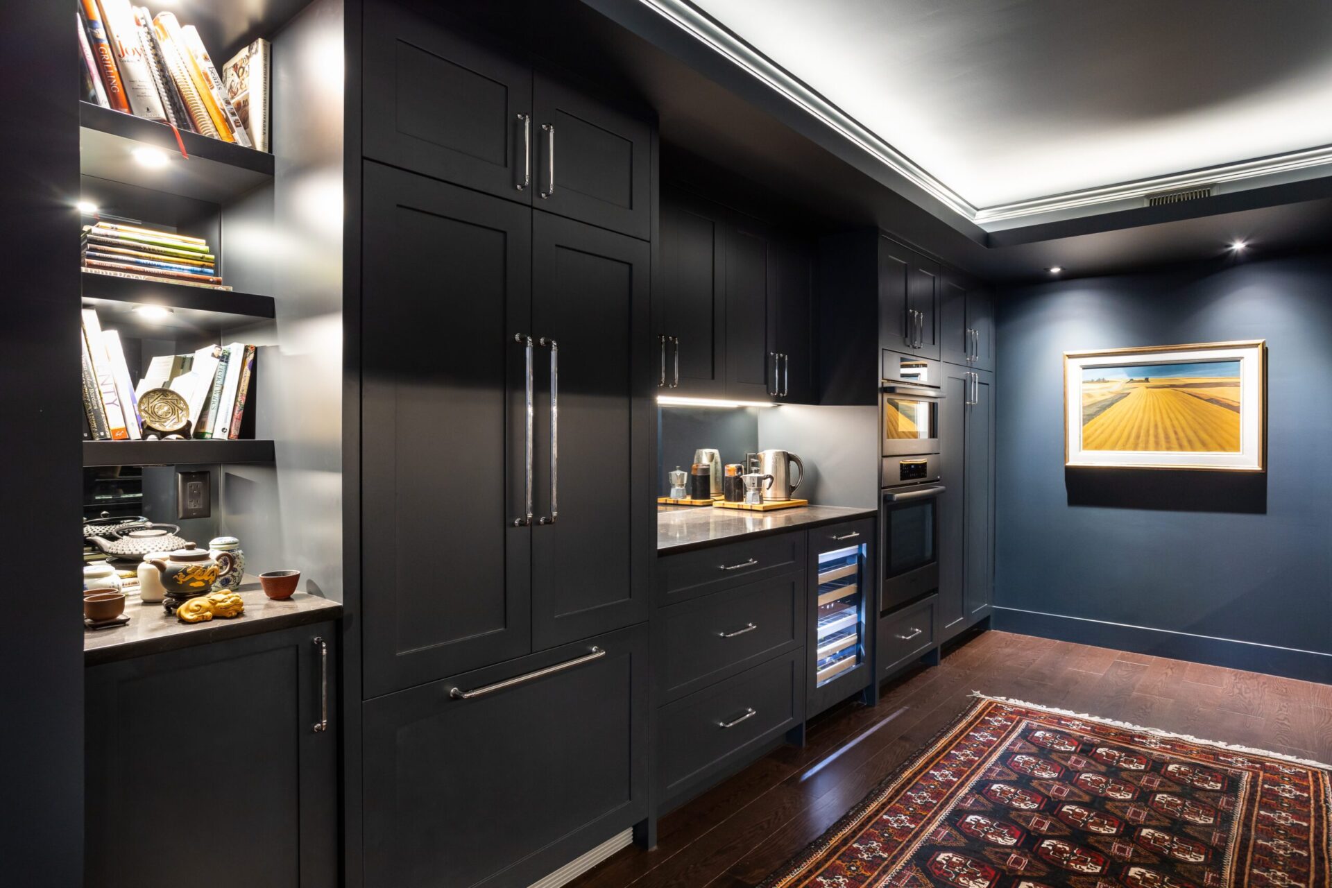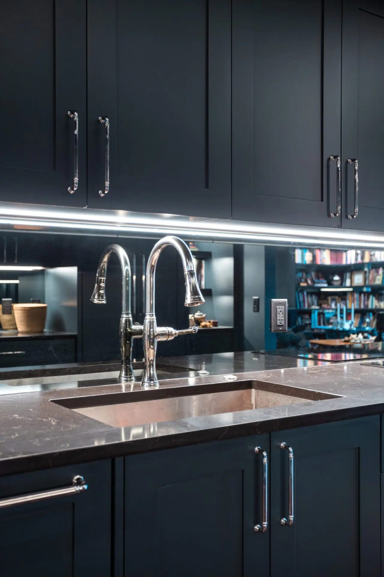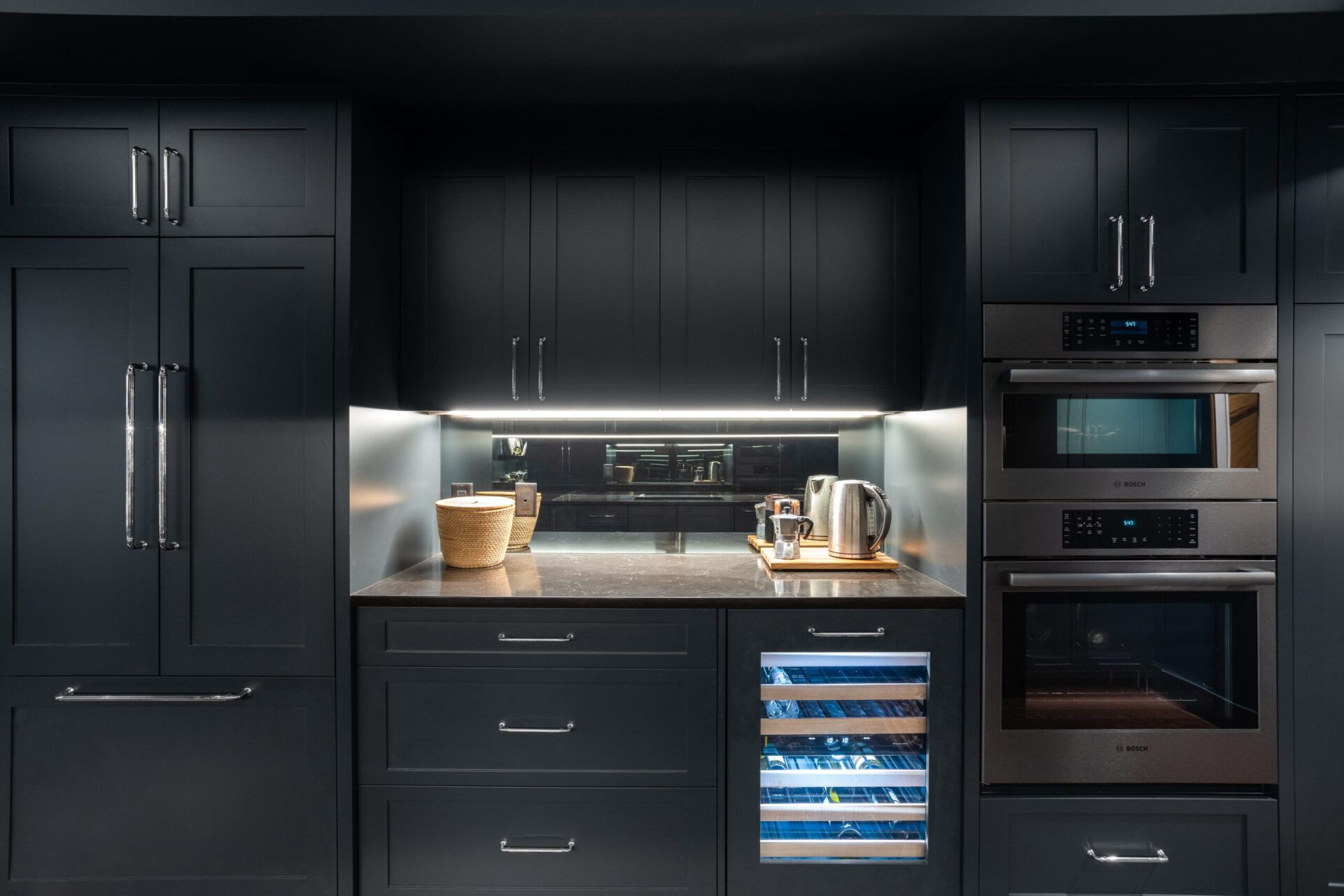 This cabinet Renovation project in Eau Claire Estates embodies luxury and sophistication through its use of dark, moody cabinetry and refined materials. The design centers around a galley-style kitchen, where custom dark millwork takes the spotlight. The deep, rich tones of the cabinetry create a dramatic contrast against the lighter elements in the space, making a bold statement.