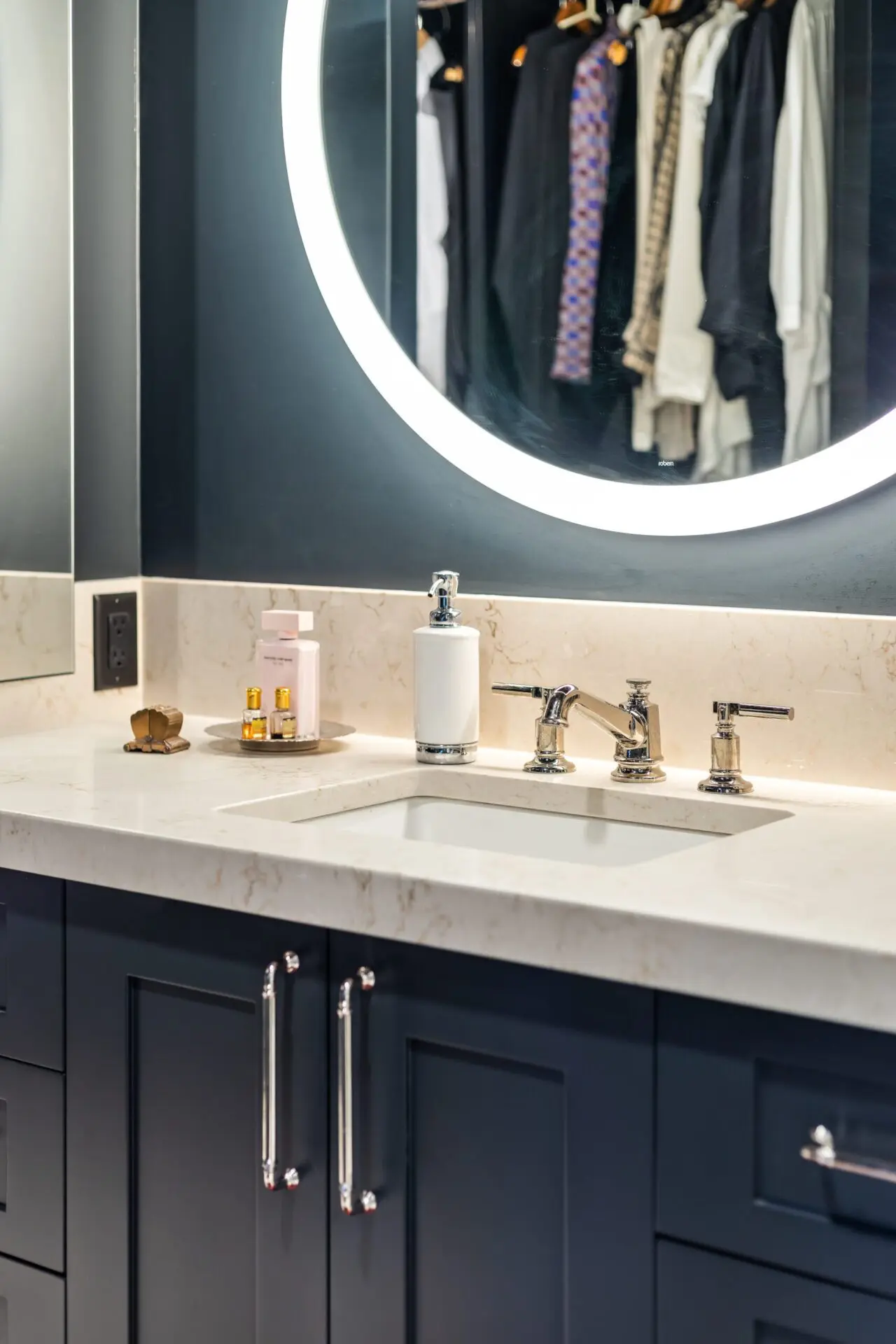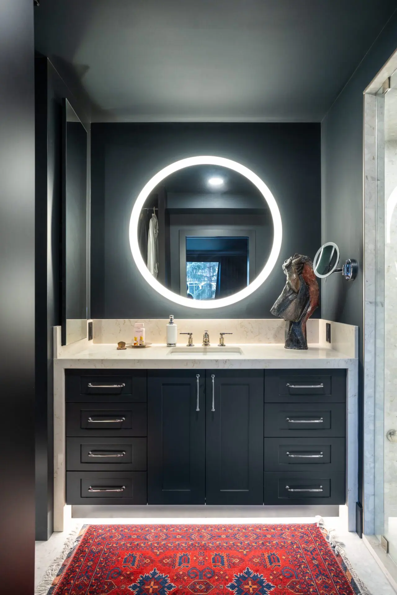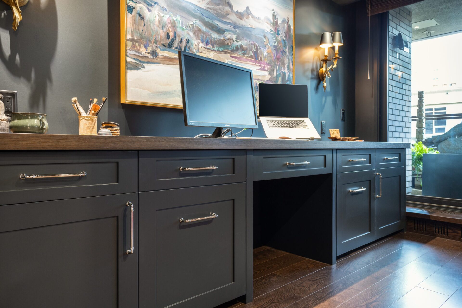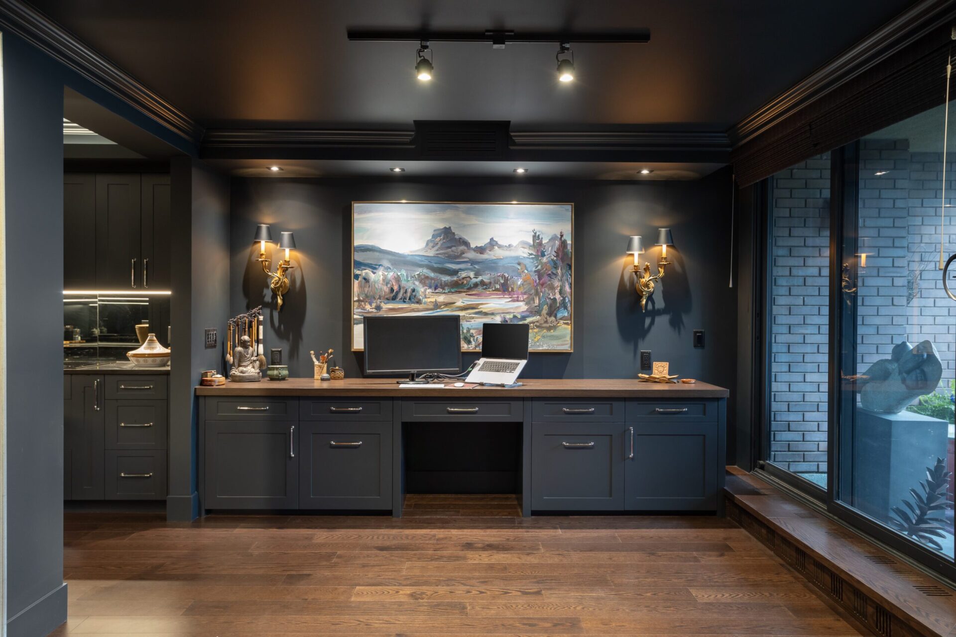 This cabinet Renovation project in Eau Claire Estates embodies luxury and sophistication through its use of dark, moody cabinetry and refined materials. The design centers around a galley-style kitchen, where custom dark millwork takes the spotlight. The deep, rich tones of the cabinetry create a dramatic contrast against the lighter elements in the space, making a bold statement.