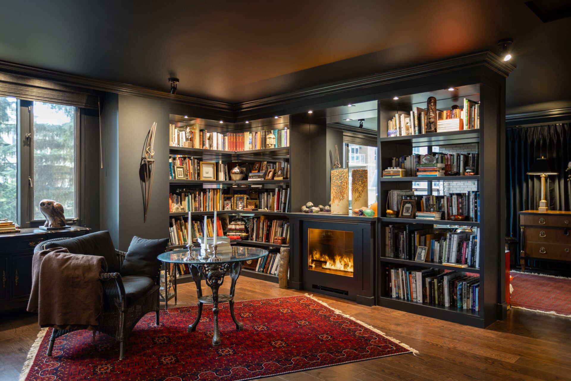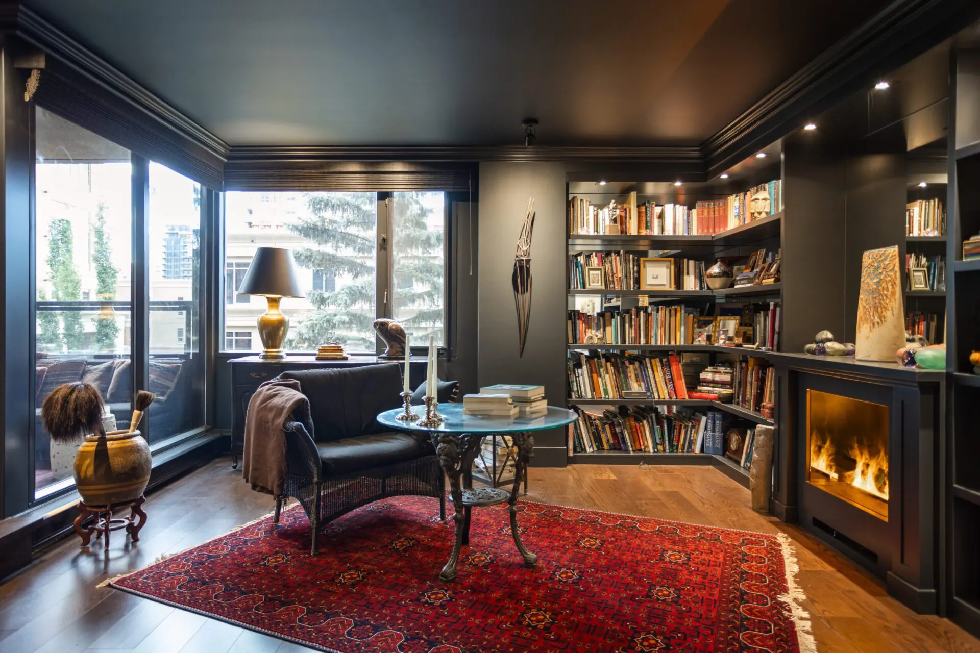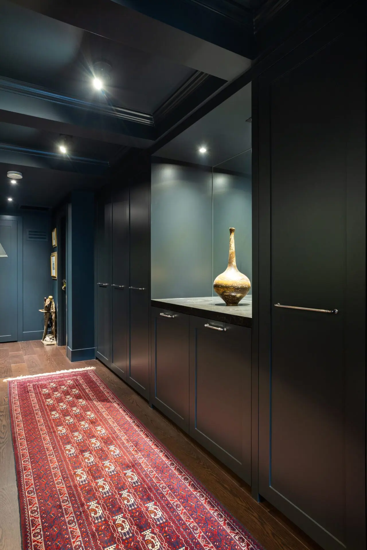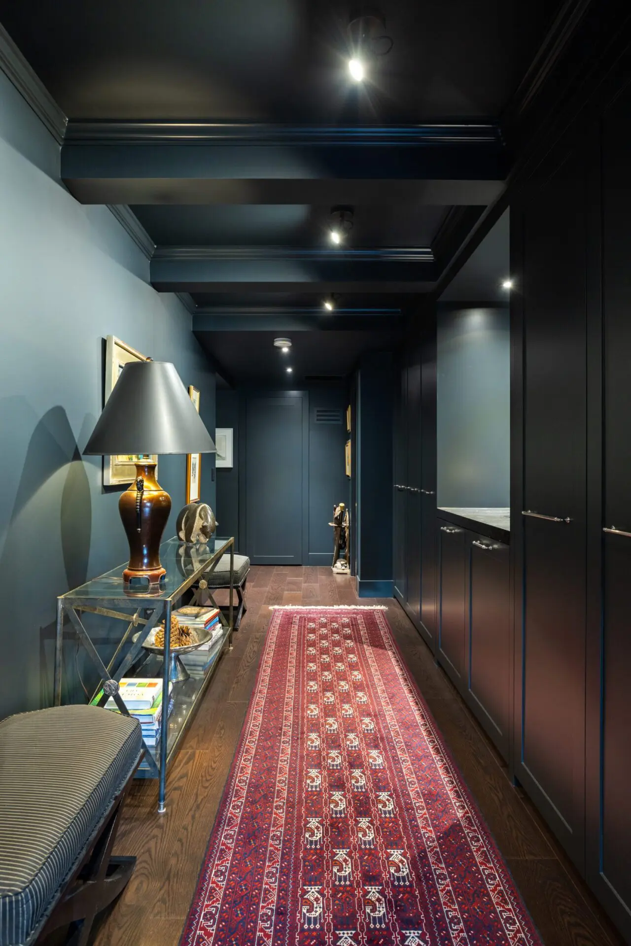 A beautifully patterned runner rug adds a touch of color and texture to the dark wood floors, tying the space together and infusing it with a sense of coziness. The carefully curated decor, including a framed piece of art on the far wall, adds a personal touch that complements the luxurious ambiance.