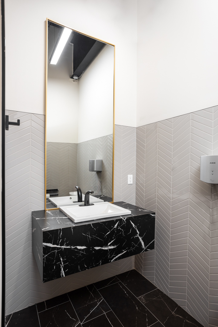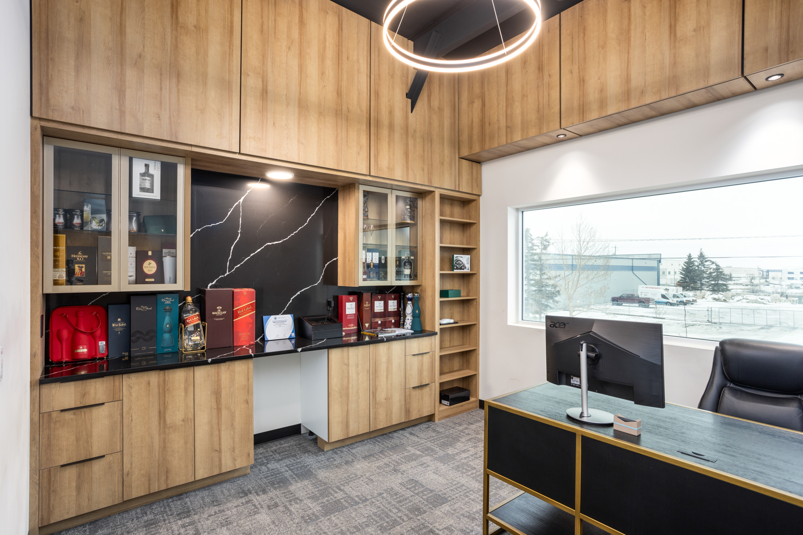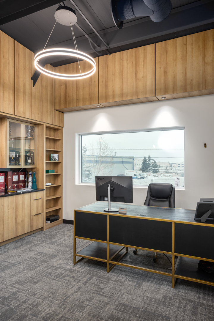 The design of the “EMF Contracting Ltd” office space masterfully combines functionality with contemporary aesthetics, creating an environment that is both stylish and conducive to productivity. The use of natural wood in various shades across the space adds a warm, welcoming tone, which contrasts beautifully with the sleek black accents and modern furniture pieces. This balance gives the office a professional yet inviting atmosphere.