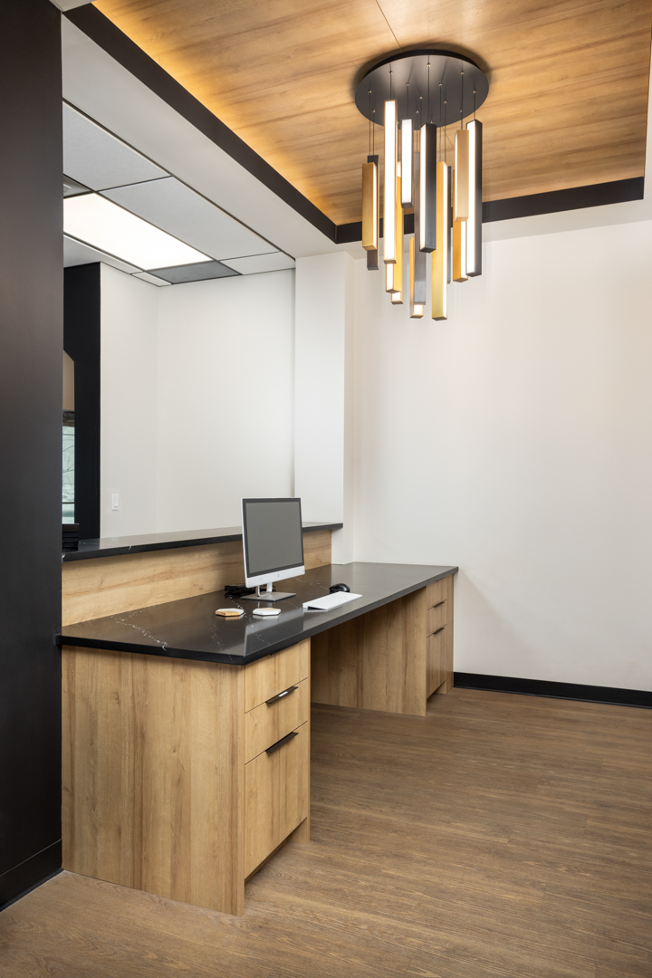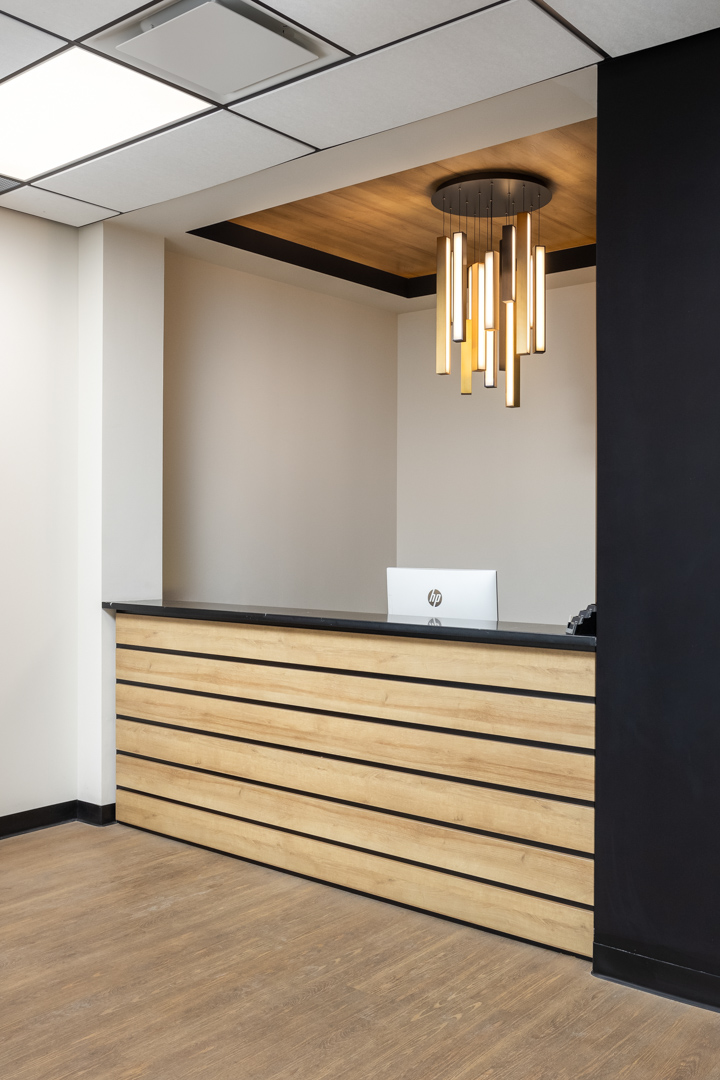 - Reception Area: The welcoming reception desk is crafted from layered wood strips, presenting a textured look that immediately catches the eye. The backdrop features a bold black wall with the company’s logo illuminated in blue, creating a striking visual focal point that embodies the company’s brand identity.