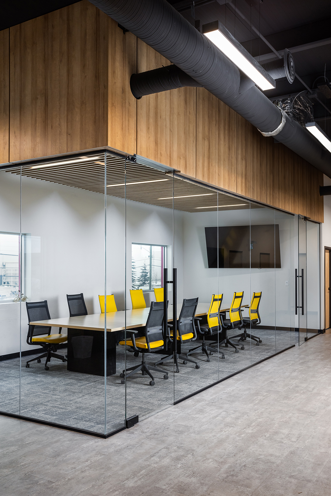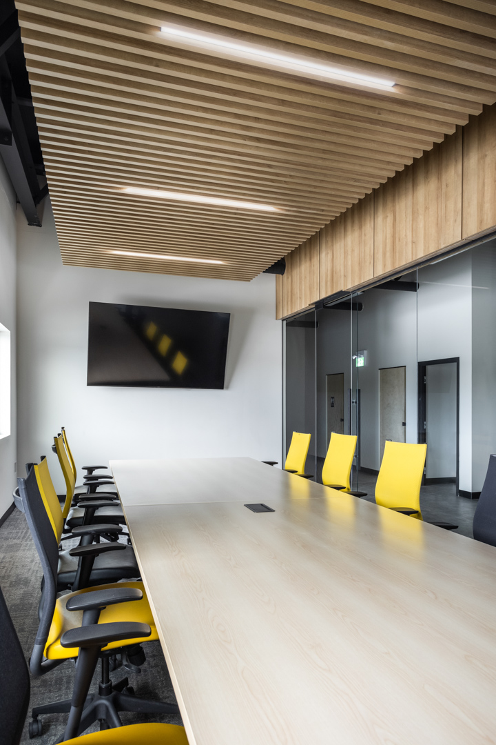 - Boardroom: The boardroom design is sleek and functional, featuring a large, centrally placed table surrounded by stylish black chairs with yellow accents. The wooden paneling on the walls and the modern light fixtures overhead combine to create a space that is both impressive and welcoming.