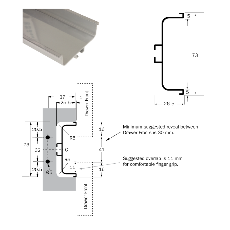 Eureka LAGUNA is a European inspired aluminum profile designed for contemporary kitchens. Creating a designer-friendly separation between cabinet doors, pantry doors, and drawer levels, this on-trend alternative to standard decorative handles and knobs offers you the chance to provide your clients with something different and blow them away with this impressive design trend.
