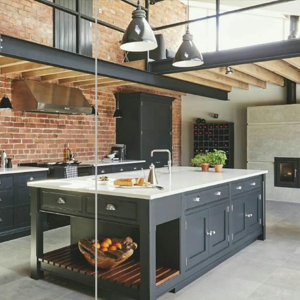 The loft-style island exudes an understated and effortlessly cool aesthetic. Its design is minimalistic and straightforward, with a focus on raw materials. A rugged wooden plank, steel, or stone tabletop can rest on brickwork or sturdy metal legs crafted from repurposed pipes. The island is typically large and symmetrical, with a clean and concise design. It serves as a functional work area or provides additional storage space. For added versatility, the island can be extended to include a simple dining table.