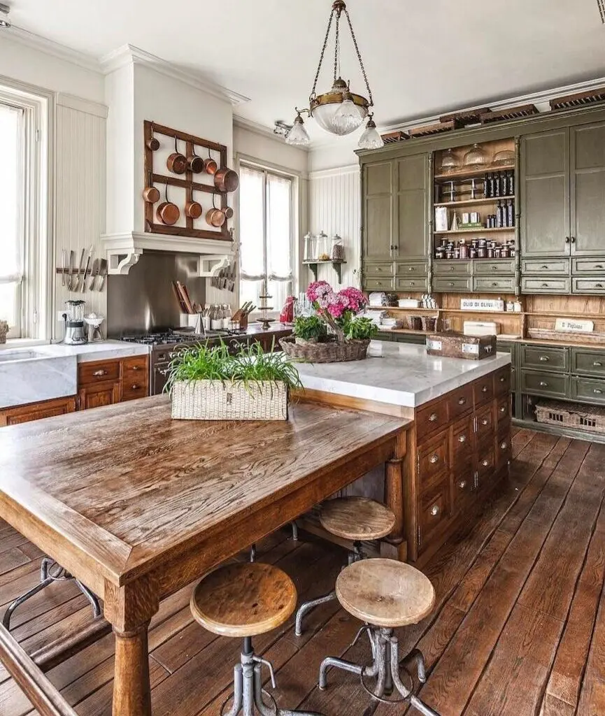 The country style embraces a sense of natural intimacy, emphasizing the use of organic materials and a simple design aesthetic. In a country-style kitchen island, you will often find a humble wooden structure painted with light hues or adorned with a transparent varnish. The tabletop is typically made of natural stone, adding to the rustic charm. Wrought iron decor and fittings are welcomed, infusing a touch of elegance into the design.